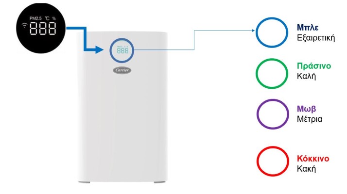 Η συσκευή αναγνωρίζει την ποιότητα του αέρα και η φωτεινή της ένδειξη αλλάζει χρώμα, ανάλογα με το επίπεδο καθαρότητας του αέρα: Εξαιρετική (Μπλε), Καλή (Πράσινο), Μέτρια (Μοβ), Κακή (Κόκκινο).
